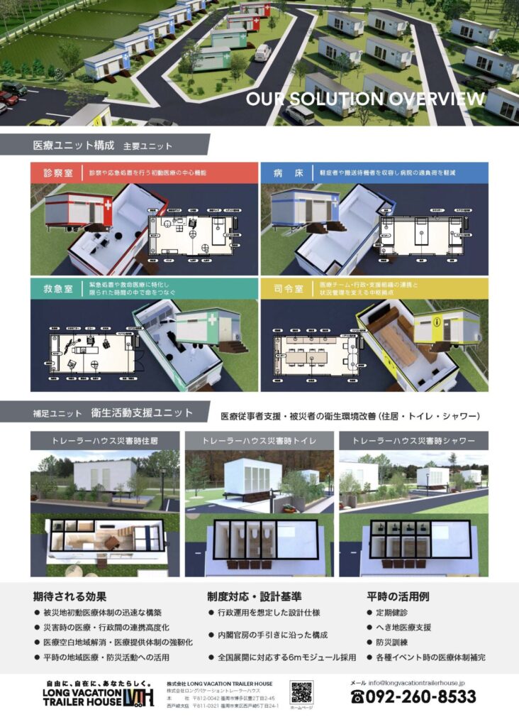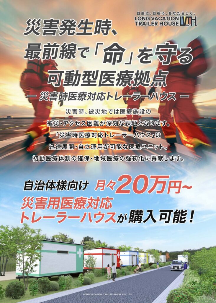 被災直後の初動対応から、平時の健診・地域医療支援・防災訓練まで、多目的に活用できる災害時トレーラーハウス(医療・衛生ユニット)のご案内です。診療機能や指令・待機スペース、衛生活動支援ユニット(住居・トイレ・シャワー)など、用途に合わせて構成・カスタマイズが可能です。