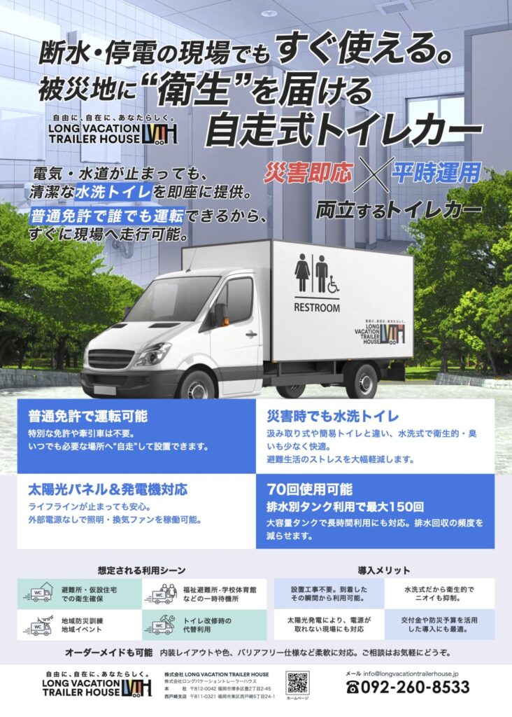 設置工事不要・普通免許で運転可・水洗式で衛生的。平時の地域イベントや工事代替、福祉避難所の機能強化など、用途に応じたカスタマイズにも対応いたします。